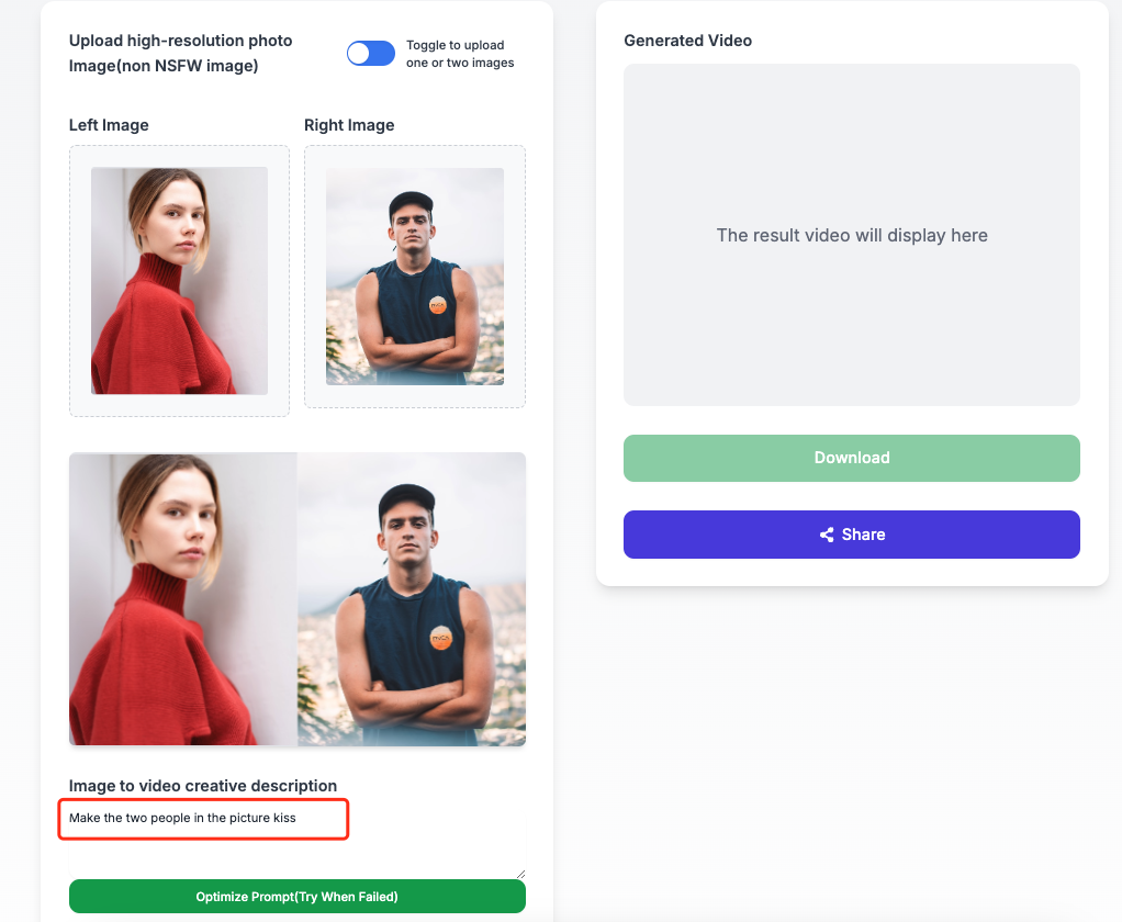 Next, provide a prompt that describes the desired video. You can use the default prompt or customize it to specify details such as facial expressions or Kissing action