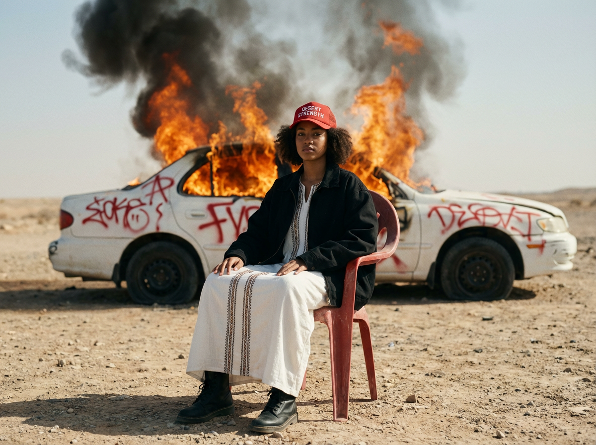 realistic flame illumination. Environmental realism: heat distortion above fire, drifting smoke, dust and sand texture, distant rocky desert horizon. Editorial cinematic vocabulary: political fashion editorial, indie film realism, symbolic composition, controlled chaos. Composition rules: centered subject dominance, strong vertical symmetry, deep background separation. hyperrealistic detail, filmic grain, volumetric smoke, dynamic fire light, tactile fabric textures, tonal contrast, natural imperfection, cinematic stillness