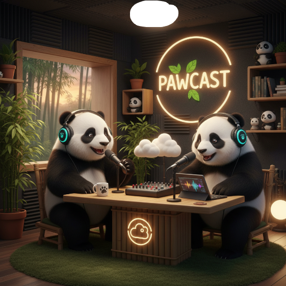 Two pandas are hosting a podcast program and speaking English